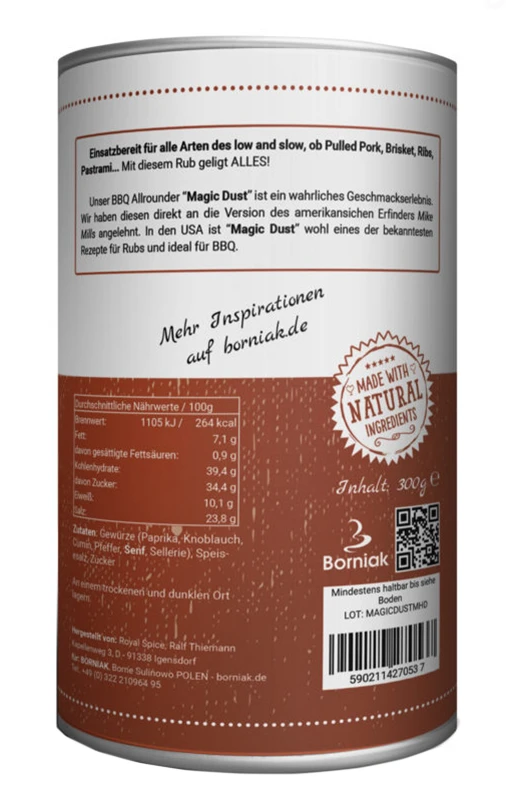 Die Rezeptur für die Borniak Magic Dust Gewürzmischung basiert auf der Original Mischung der amerikanischen BBQ-Legende Mike Mills. Die Kombination aus Paprika, Knoblauch, Cumin, Pfeffer, Senf, Sellerie, Speisesalz und Zucker ergibt einen einzigartigen Geschmack, den Sie sicher lieben werden.
