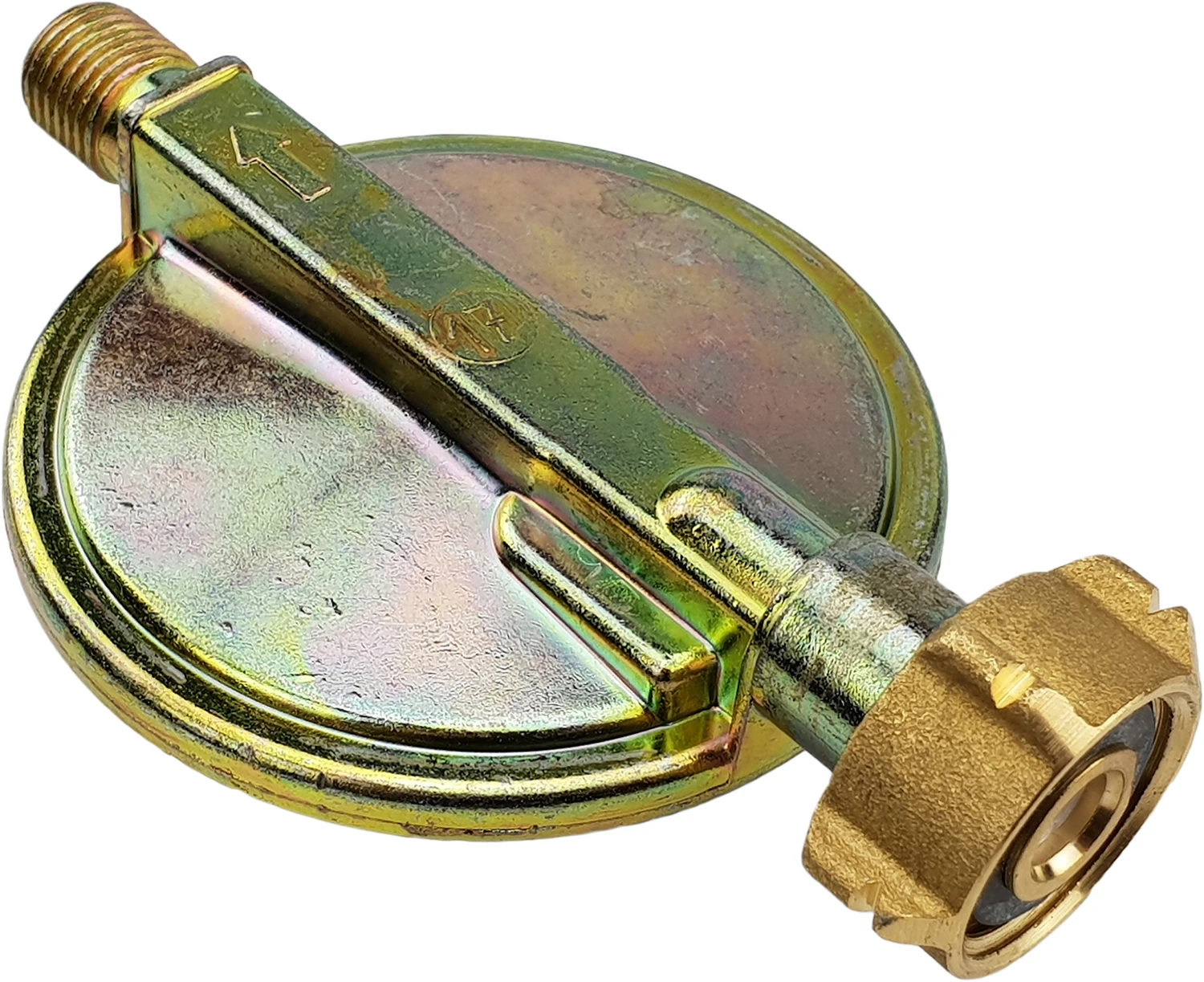 Der Druckminderer lässt sich auf Schweizer Gasflaschen schrauben und regelt den Druck auf den in Deutschland gebräuchlichen Arbeitsdruck von 50 mbar herunter.