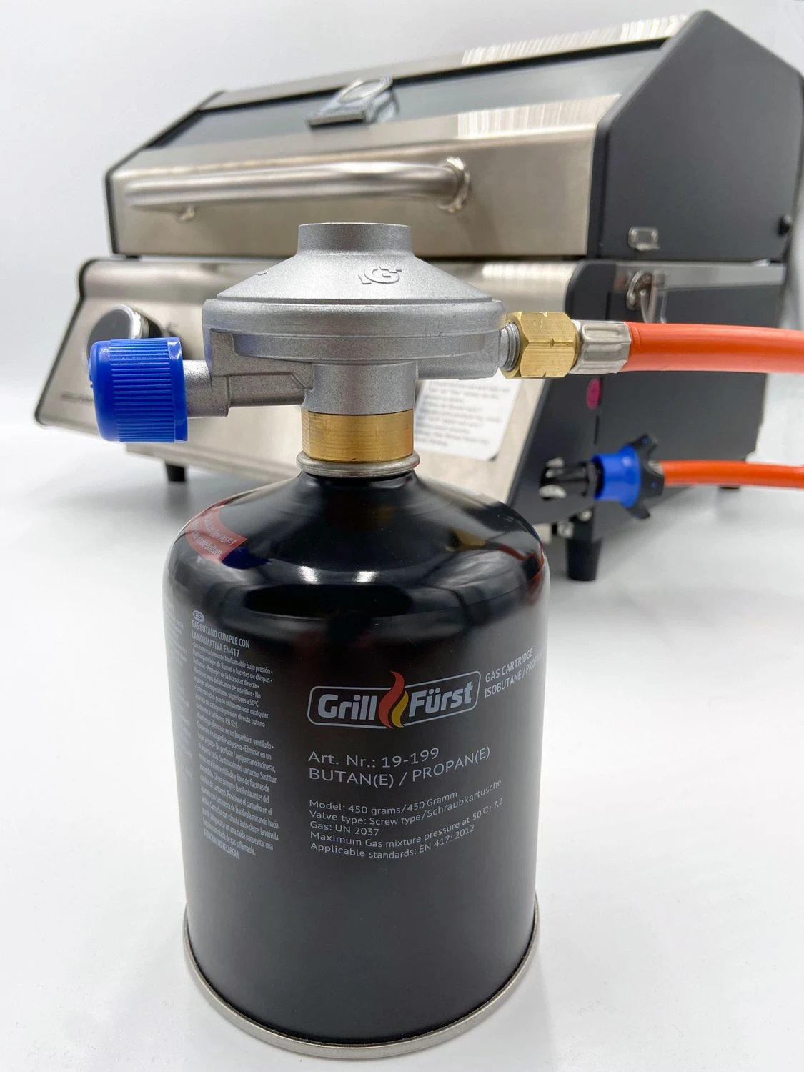 Herkömmliche Gasgrills werden einfach mit einem Gasschlauch und Druckminderer für Schraubkartuschen ausgestattet. Die Gaskartusche wird in dem Fall direkt am Druckminderer angeschlossen.
