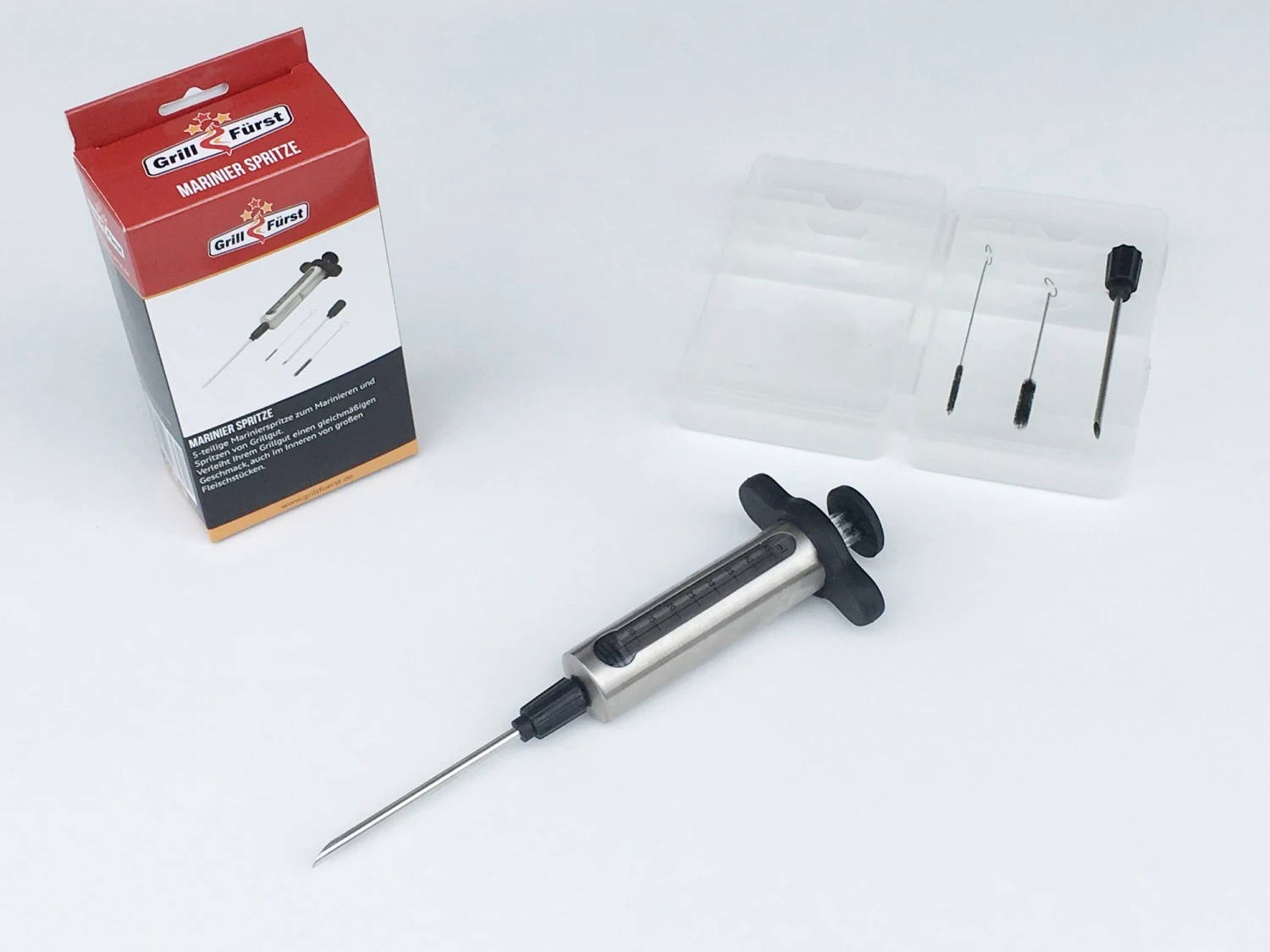 Die Grillfürst Marinierspritze ist das ideale Hilfsmittel, um Fleisch von innen zu würzen und dabei saftig zu halten.
