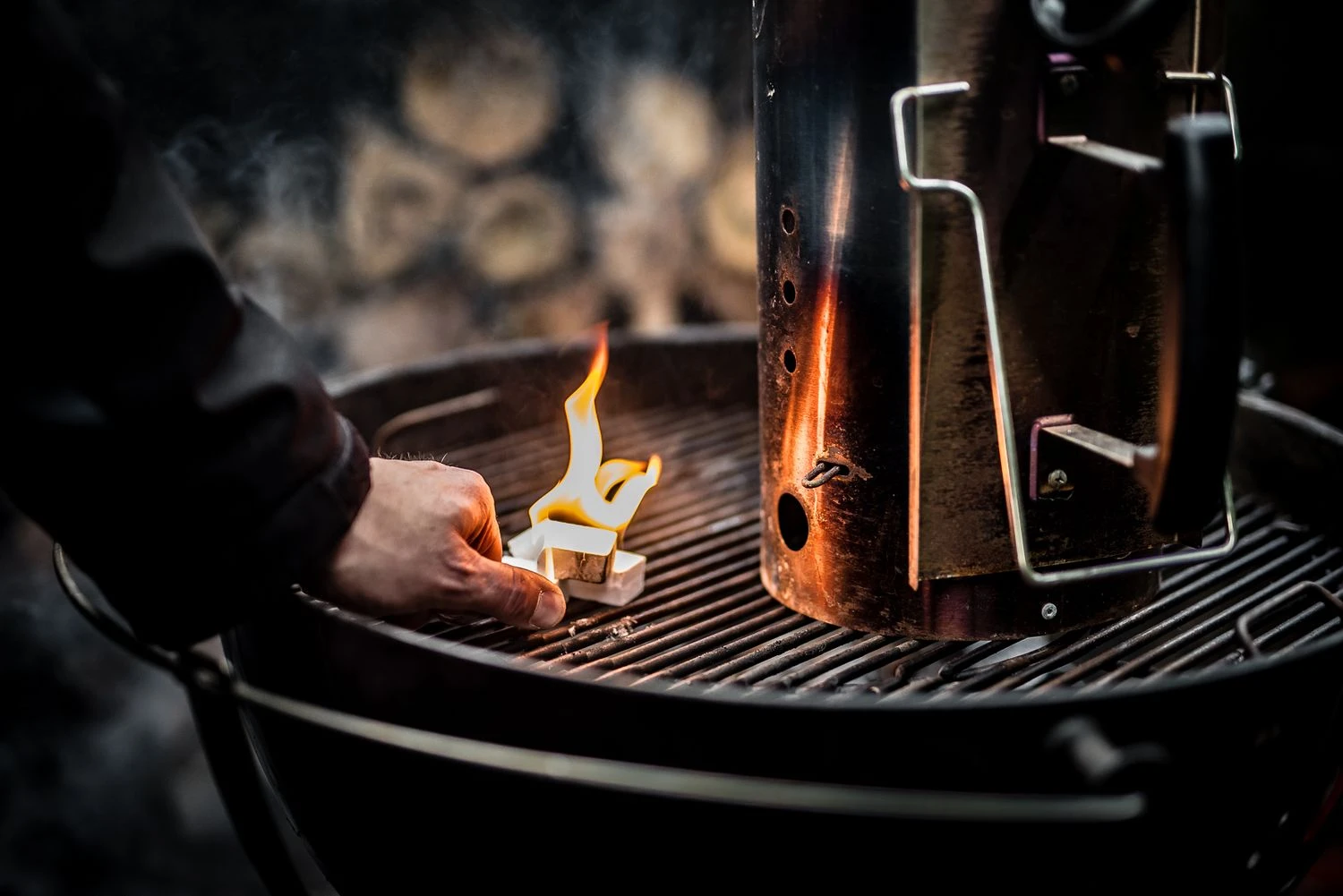 Alternativ einen oder mehrere Würfel auf eine kleine Lage Brennstoff (Holzkohle, Holz, Kohle, Briketts) legen und anzünden. 1 oder 2 Minuten brennen lassen und weiteren Brennstoff hinzufügen und darauf achten, dass die Flammen dabei nicht ersticken.