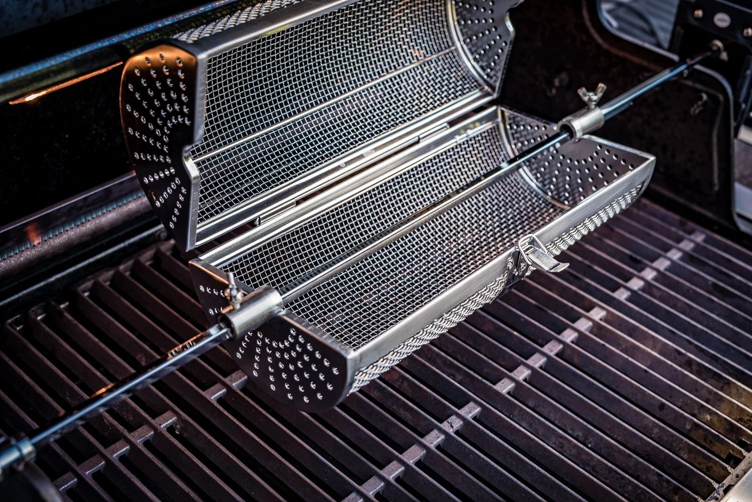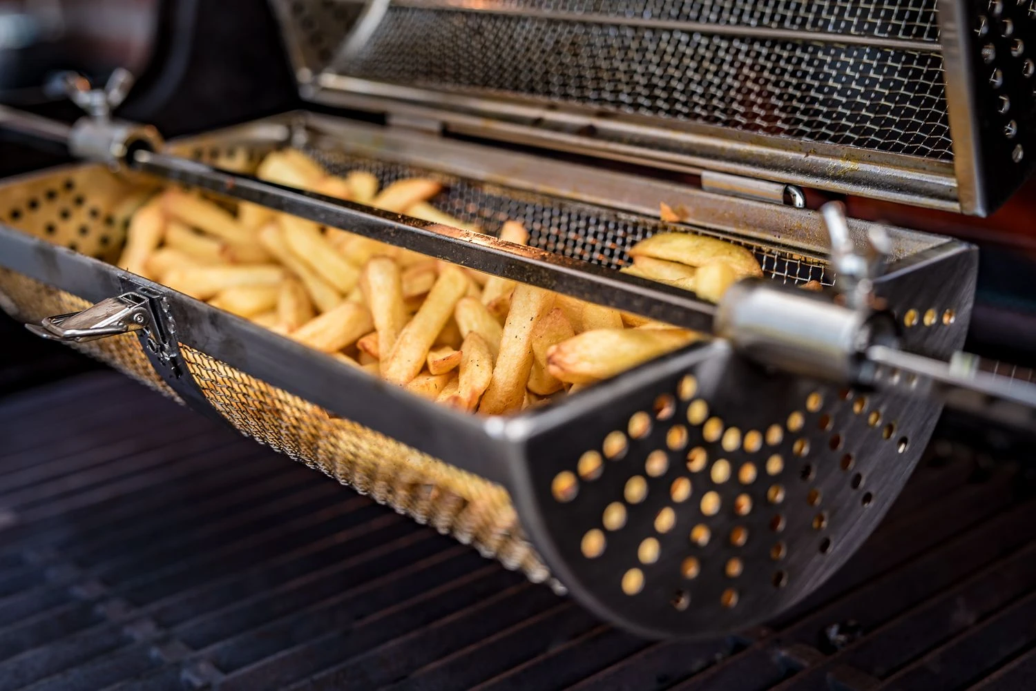 Jetzt sind Ihrer Kreativität keine Grenzen gesetzt: Besonders gut gelingen in dem Rotisseriekorb knusprige Pommes, Kartoffel Wedges oder auch leckere geröstete Kartoffelscheiben. Durch das besonders feine Drahtgeflecht ist es möglich, auch sehr kleines Grillgut perfekt zu garen, ohne dass etwas herausrutscht. Auch Popcorn kann auf diese Weise einfach direkt am Grill zubereitet werden.