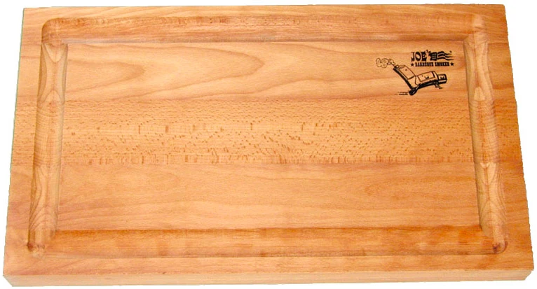 Attraktives Schneidbrett in massiver Bauweise mit eingearbeitetem JOE´s Barbeque Smoker Logo.