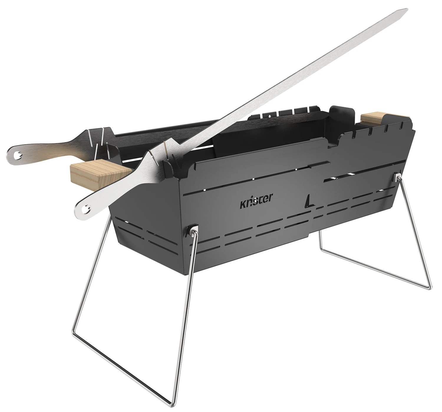 Die Grillschwerter lassen sich in vier verschiedenen Positionen einfach am linken und rechten Rand des Knister Grills eingehängen. So wird das Grillgut nicht nur von beiden Seiten perfekt gegart, sondern kann zusätzlich wahlweise in einem 74° oder einem 94° Winkel über der Glut positioniert werden.
