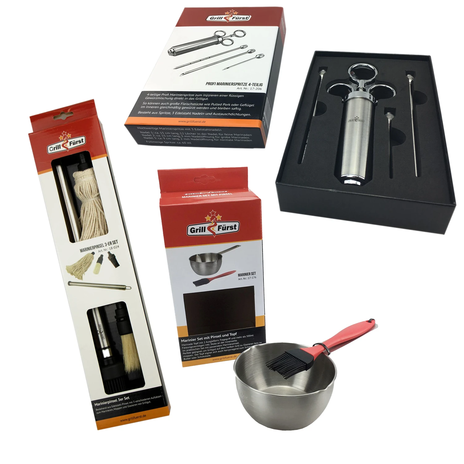 Grillfürst Marinieren Starterset mit Profi-Marinierspritze, Marinierpinsel Set mit 3 Ausätzen inkl. Mop, Mariniertopf mit Silikonpinsel