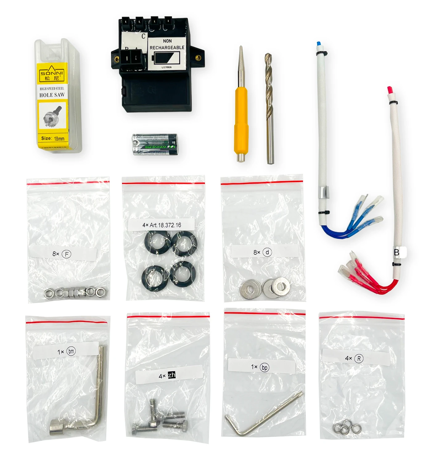 Inkl. Bohrkrone und Bohrschablone, Zündbox, Zündkabel, Metallbohrer und weiteres Montagematerial.