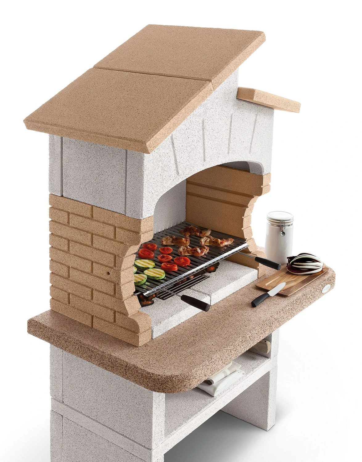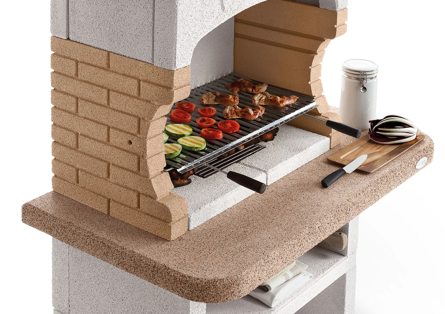 Der Grillkamin aus extrem witterungsbeständigem und langlebigen Marmotech punktet mit einer besonders schicken Ziegelsteinoptik und Feuerplatten aus Schamott. Das sorgt nicht nur für eine ideale Hitzespeicherung, sondern auch für eine perfekte Hitzeverteilung auf der Grillfläche.