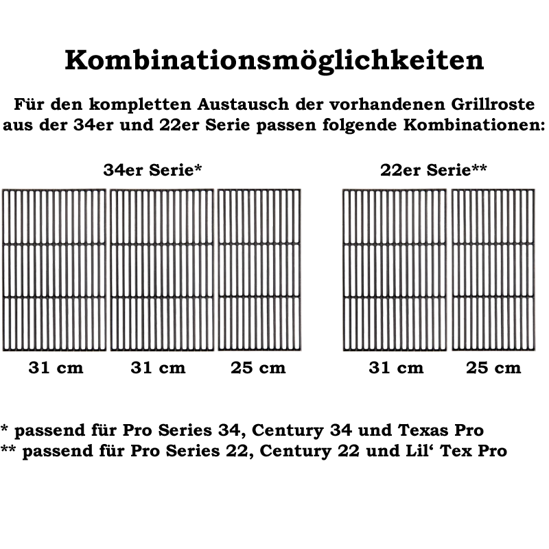 Der Gusseisenrost ist passend für den Traeger Pro Series 22 sowie 34 und Traeger Century 22 und 34. Der Rost kann kann hier entweder einzeln eingelegt werden oder in Kombination mit dem Gussrost 31 cm x 49 cm verwendet werden, um die Grillfläche komplett mit Gussrosten auslegen zu können. Für die 22er Modelle benötigen Sie 1x den 25er Grillrost und 1x den 31er Grillrost. Bei den größeren 34er Modellen wird dann ein weiterer 31er Grillrost benötigt um die Grillfläche komplett mit Gusseisenrosten auszustatten.